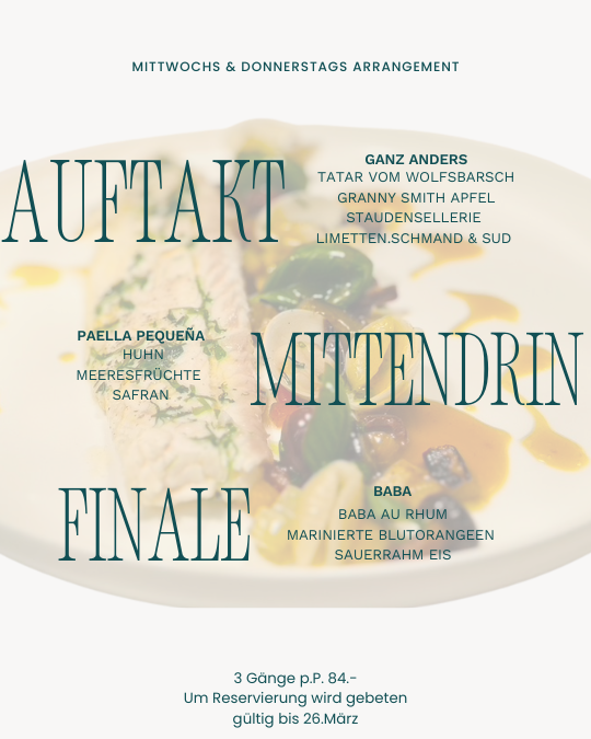 An diesen Winterabenden bieten wir Ihnen neben unserem À-la-carte-Menü ein besonderes 3-Gänge-Menü für zwei Personen an. Als besonderes Highlight im Februar und März, gibt es im Hauptgang eine Paella. Wir bitten um Vorabbestellung im Zuge der Reservierung. 3 Gang Menü p.P. 84.-