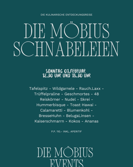 Erleben Sie eine genussvolle Reise durch die möbius Küche mit allen unseren liebsten Gerichten – in liebevoll zubereiteten Miniaturen.Dieser besondere Tag lädt Sie ein, ganz entspannt einen Sonntagmittag oder -abend mit Ihren Liebsten, Freunden oder der Familie zu verbringen. Teilen, probieren und schnabulieren Sie nach Herzenslust – unser Schnabeleien-Tag ist die perfekte Gelegenheit zum gemeinsamen Genießen und Entdecken. Gönnen Sie sich und Ihren Gästen ein entspanntes kulinarisches Erlebnis voller Vielfalt, Charme und hochwertigen Geschmäckern. Menü inkl. Aperitif p.P. 110.-