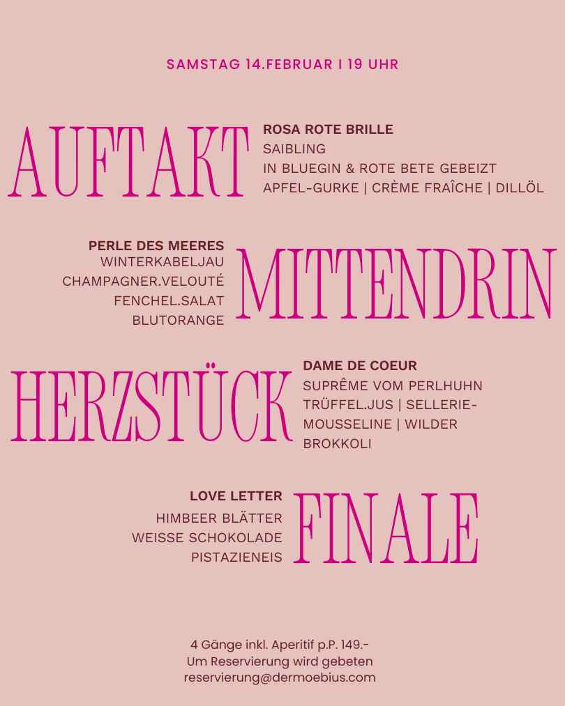 Am Samstag, den 14.Februar 2026 erwartet Sie ein Menü voller Liebe. Wir beginnen um 19 Uhr und laden Sie zu einem Aperitif ein.Genießen Sie ein 4 Gänge Menü in unserem Zuhause- einem stilvollen ruhigen Ort. Menü inkl. Aperitif 149.-